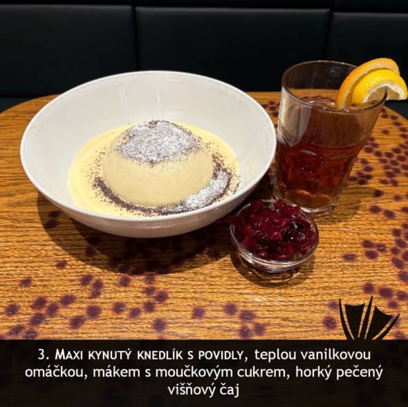Velký kynutý povidlový knedlík s vanilkovým krémem, cukrem a mákem