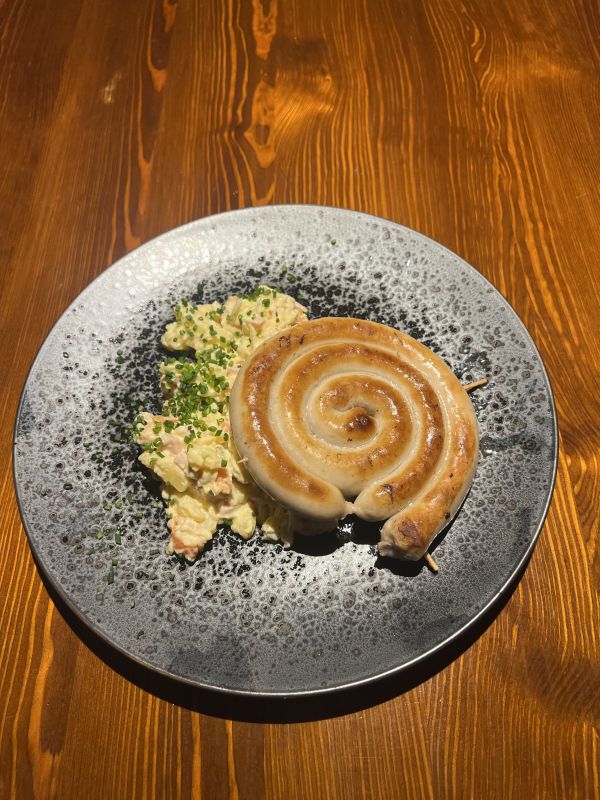 Smažená vinná klobása, vařené brambory, tatarská omáčka