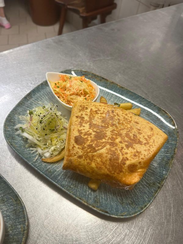 Menu dne Malá polévka Vývar s masem a nudlemi / Zelná bílá (zdarma) 150g Smažený vepřový řízek, bramborový salát 1, 3, 7