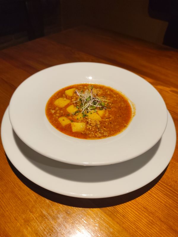Bramborový krém + Pikantní vepřová směs s játry a jasmínovou rýží