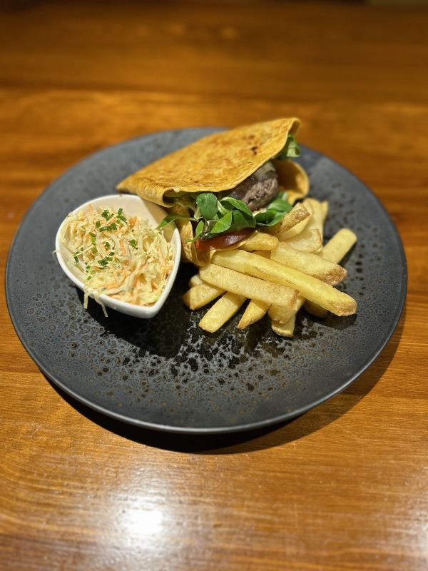 150 g Burger z hovězího trhaného masa, BBQ mayo, salát, vídeňská cibulka, coleslaw z červeného zeli, bramborové dukátky (1, 3, 7) 137
