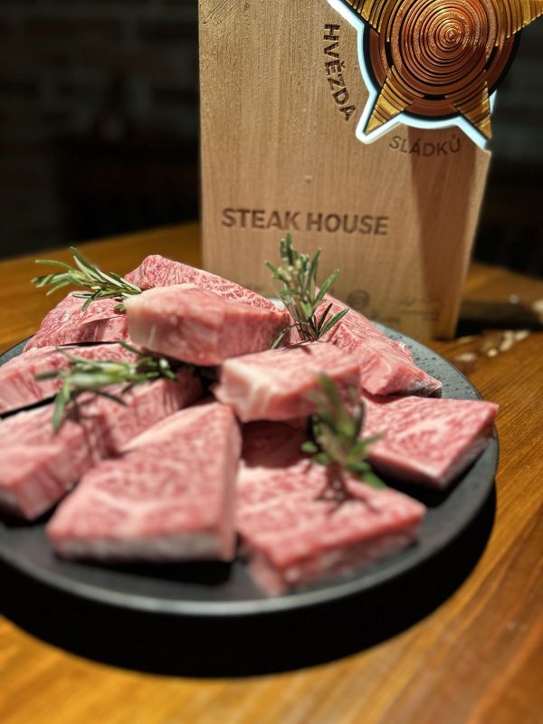Maso: Steak rib eye s pepřovou omáčkou pečené brambory, nakládaná cibule