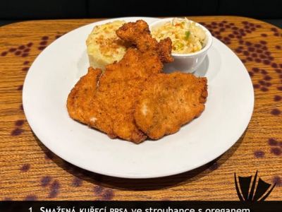 150 g Kuřecí kousky v parmazánovém těstíčku, bramborová kaše, listový salát