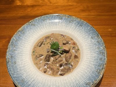 150g Hovězí maso ve svíčkové omáčce, brusinkový citrón se šlehačkou, houskový knedlík 1, 3, 7