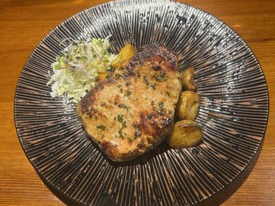 200g Marinovaná vepřová krkovička se sázeným vejcem, pečený bylinkový brambor 1, 3, 7