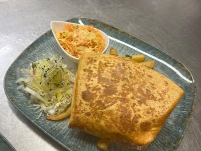 200g Tortilla s kuřecím masem a trhaným salátem, rajčátky, vinagrett dresink 1, 3, 7