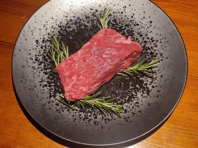 Telecí steak omáčka z portského vína, zámecké hranolky, křepelčí vejce