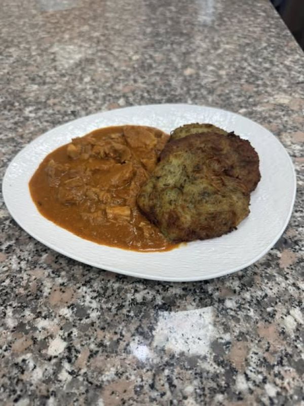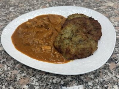 150g Kuřecí špíz, šťouchaný brambor, tatarská omáčka