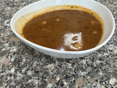 Čočka na kyselo s opečenou klobásou, okurka, cibulka+polévka