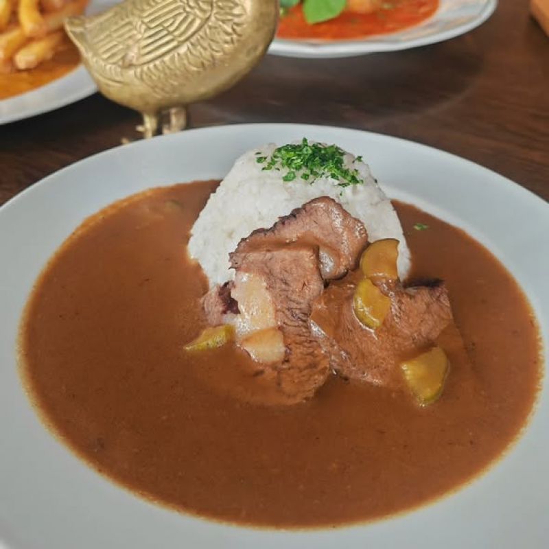 HOVĚZÍ GULÁŠ SPECIÁL - libový hovězí guláš, podávaný s houskovým knedlíkem nebo čerstvým řemeslným chlebem z hranické Chlebárny
