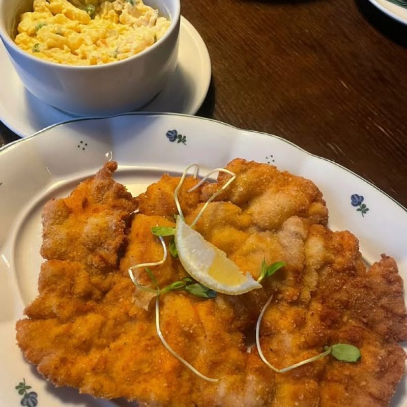 150g Smažený duel řízků (kuřecí prsa a vepřová kotleta) s domácím bramborovým salátem s majonézou A 1,3,7,9,10