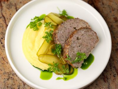 120g Sekaná vepřová pečeně, bramborová kaše, kyselý okurek