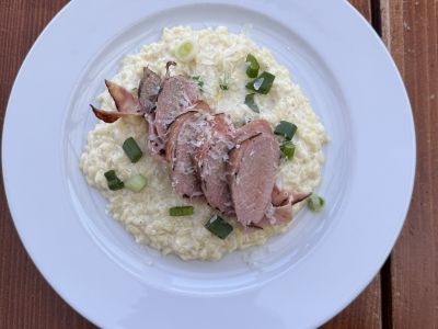 Králičí roládka, hráškové pyré, mladý hrášek, šalvej, demi – glace