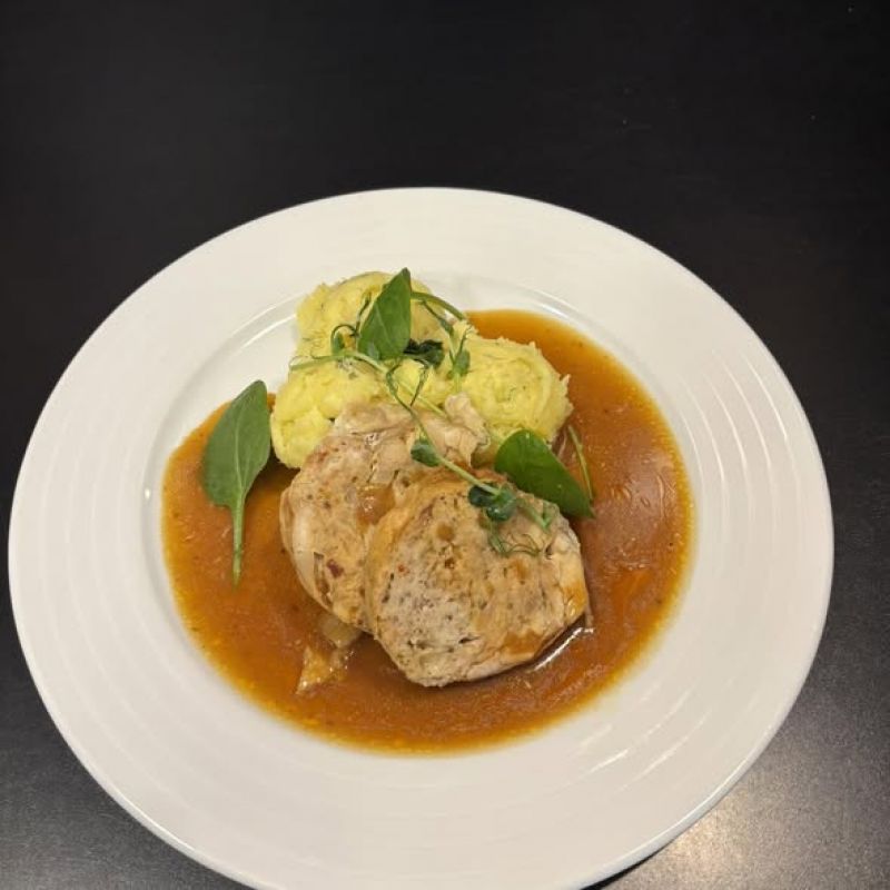 Kuřecí roláda s nádivkou, bramborová kaše, kompot
