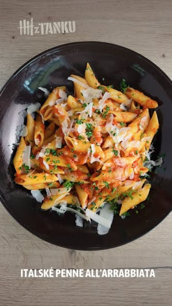 150g Penne s rajskou omáčkou, trhané kuřecí maso 1a, 3, 9