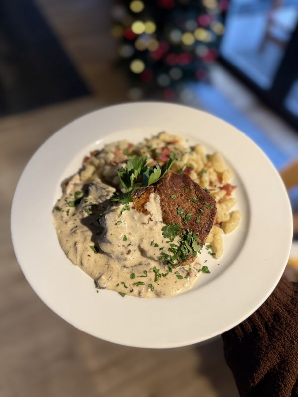 120g Vepřový kotlet na žampionech, špecle (1, 3, 7)