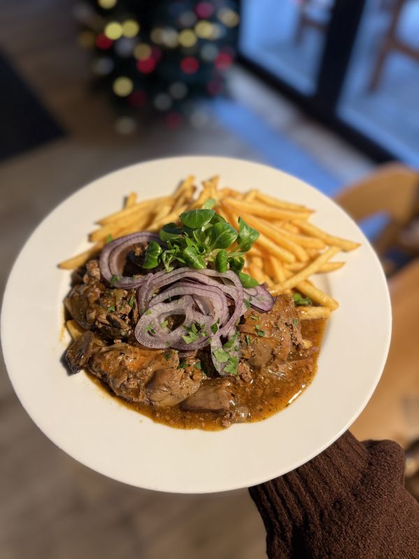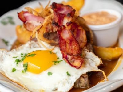 Steak z hovězí roštěné, smetanovo pepřová omáčka, opékané brambory, slaninová mayo