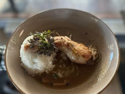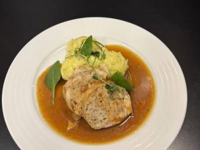 Lehce opečené filírované kuřecí prso na bylinkách, šťouchaný brambor se slaninou a cibulí