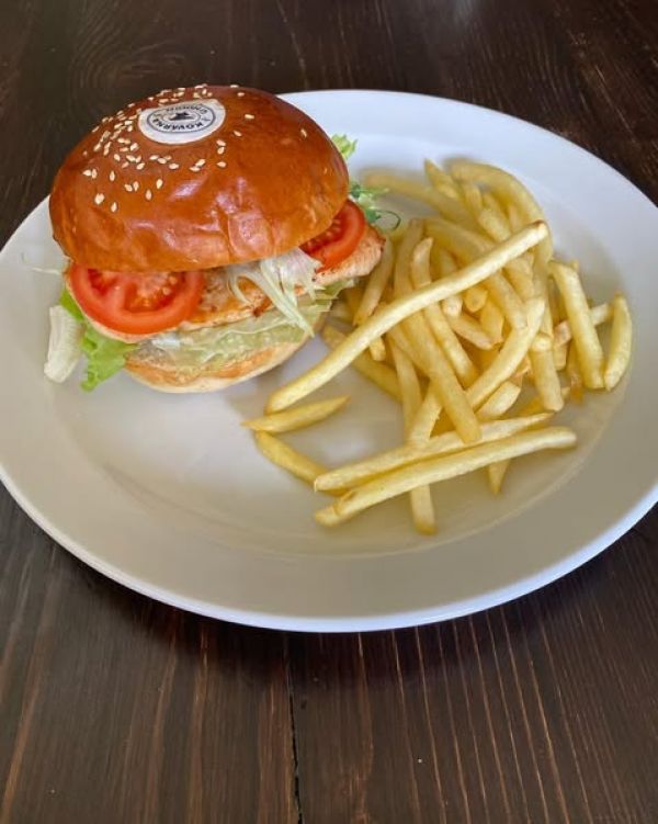 Caesar burger máslová bulka, kuřecí prso, římský salát, slanina, parmazán, caesar dresink, steakové hranolky