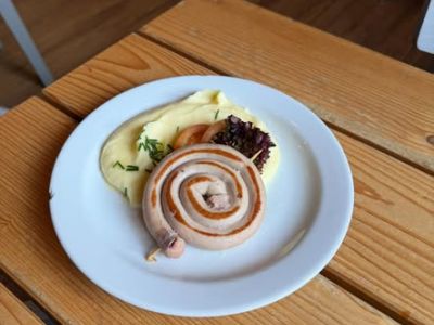 Velikonoční nádivka s uzeným masem, maštěný brambor, kyselá okurka + polévka 137