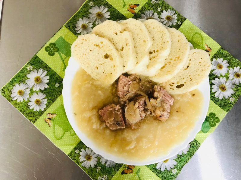 120g vepřová kýta hamburská, houskový knedlík (mj. okurka, šunka, šlehačka)