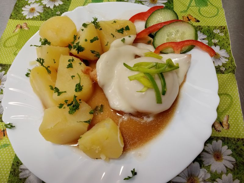 120g kuřecí plátek s broskví a sýrem, vařené brambory
