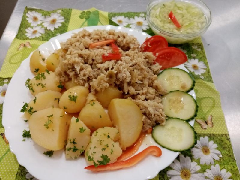 120g čevapčiči s cibulí, vařené brambory, tatarská omáčka