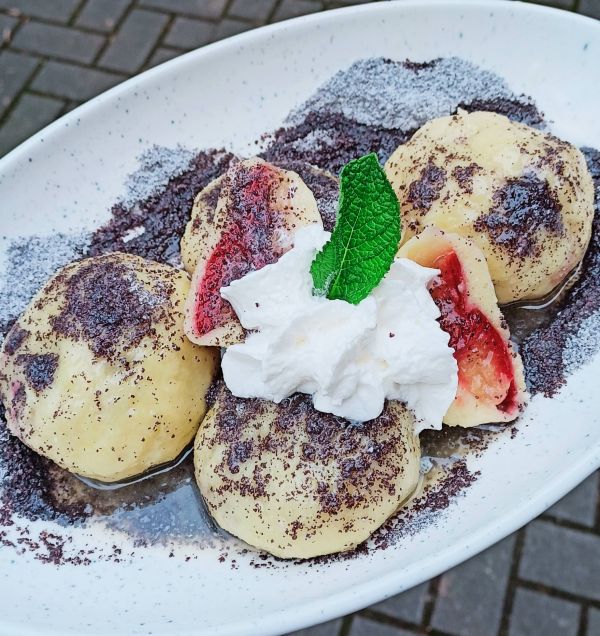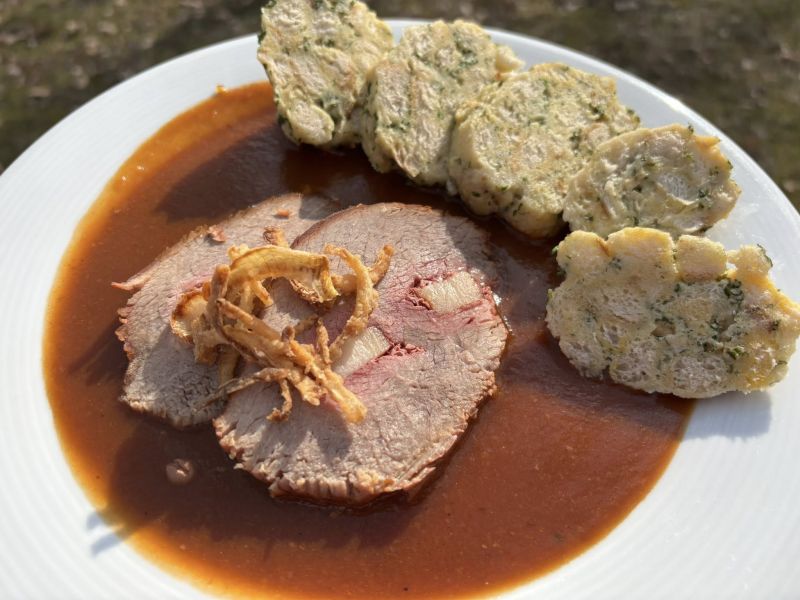 | 2. | Pečená telecí kýta špikovaná vyuzenou slaninou s perníkovou omáčkou se švestkovými povidly a červeným vínem s karlovarskými knedlíky | 219 Kč |