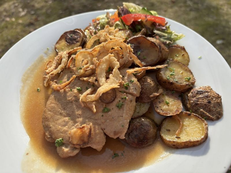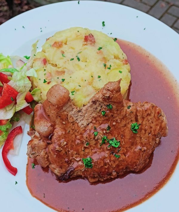 | 2. | Steak z vepřového karé na chilli omáčce s medem s opečenými bramborami a pomerančovo-šípkovým dresinkem | 179 Kč |