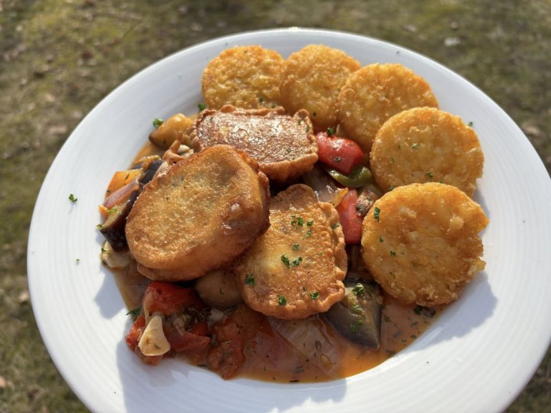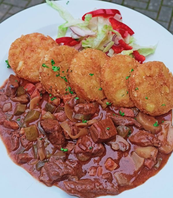 | 4. | Kuřecí nudličky v pikantní šťávě se zeleninou se smaženými rösti | 169 Kč |