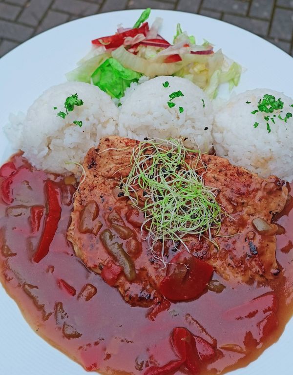 | 3. | Grilovaný steak z kuřecích prsíček s jemně pikantní omáčkou z pečených paprik a čerstvých chilli papriček s jasmínovou rýží | 175 Kč |