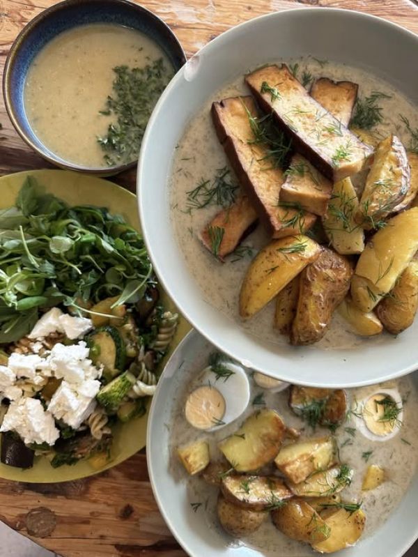 130 gr Krůtí stehno pomalu pečené na česneku s rozmarýnem, vařené brambory, salátový mix s bylinkovým dipem alergeny: 1a, 7, 10, 12
