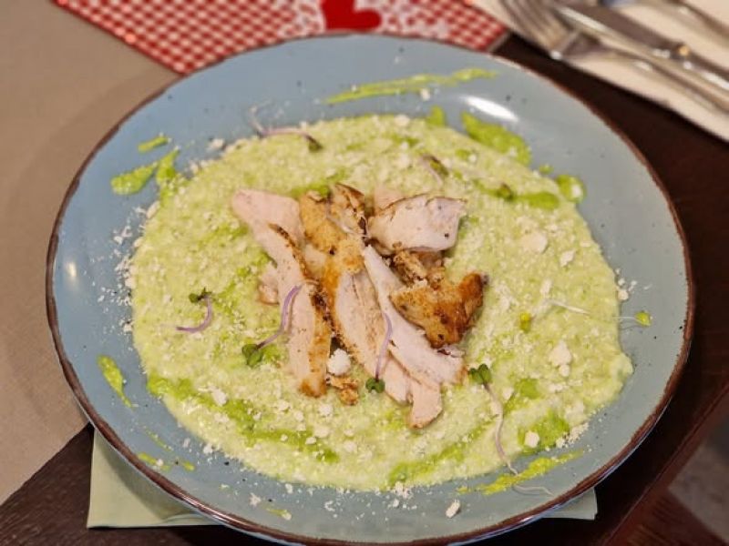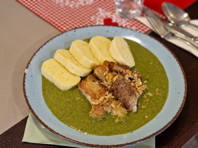 b) 120 g Špecle se zelím a trhanou vepřovou plecí zdobené křupavou cibulkou 179 Kč