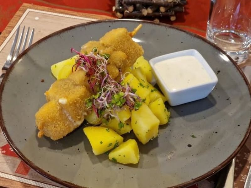 Smažená sýrová jehla se šunkou, vařený brambor s máslem, tatarská omáčka { 1, 3, 7 }