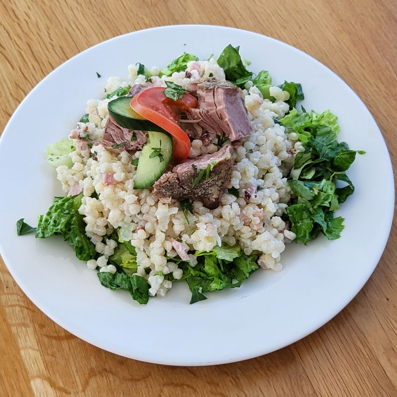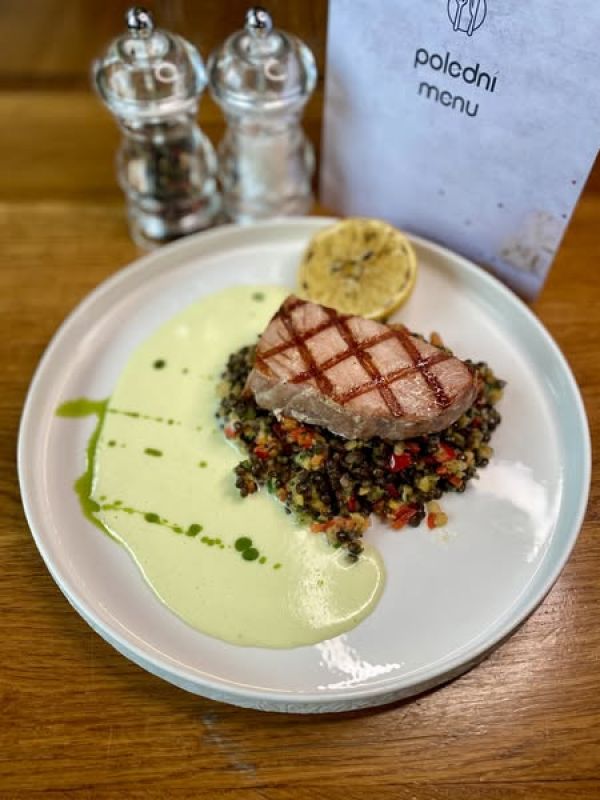 Grilovaný steak z tuňáka, brambory, koprový dip 147