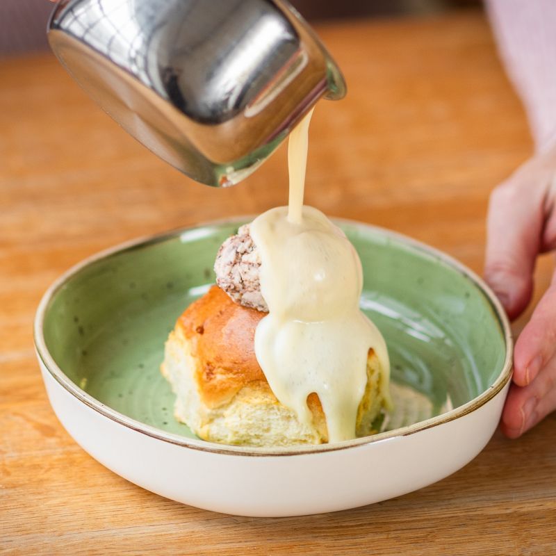 150g PANENKA PROSCIUTTO plněná šunkou Prosciutto a sýrem Mozzarella s chedarovou omáčkou podávaná s bramborem nebo hranolkami nebo s opikošema nebo s rýží