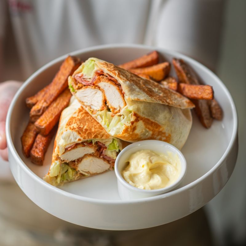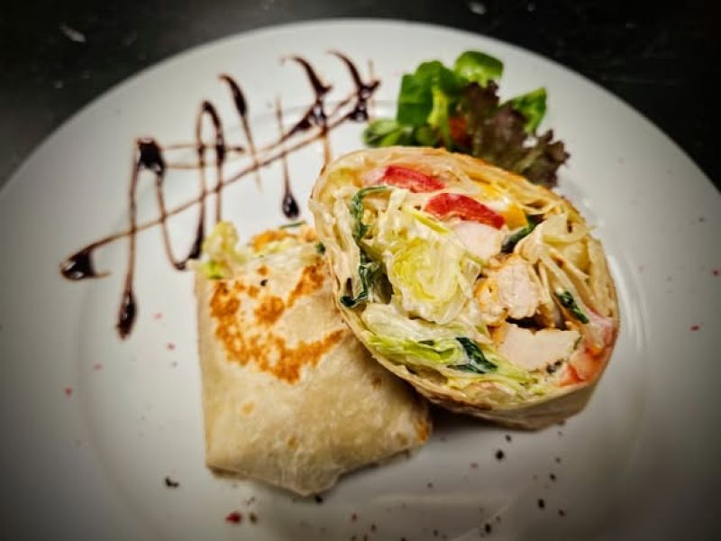 150g TACOS CHICKEN podávané s BBQ omáčkou (kuřecí prsíčko filované na jemné plátky s restovanou čerstvou zeleninkou gratinované sýrem servírované v mini tortillách)