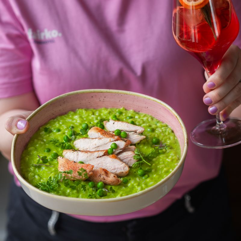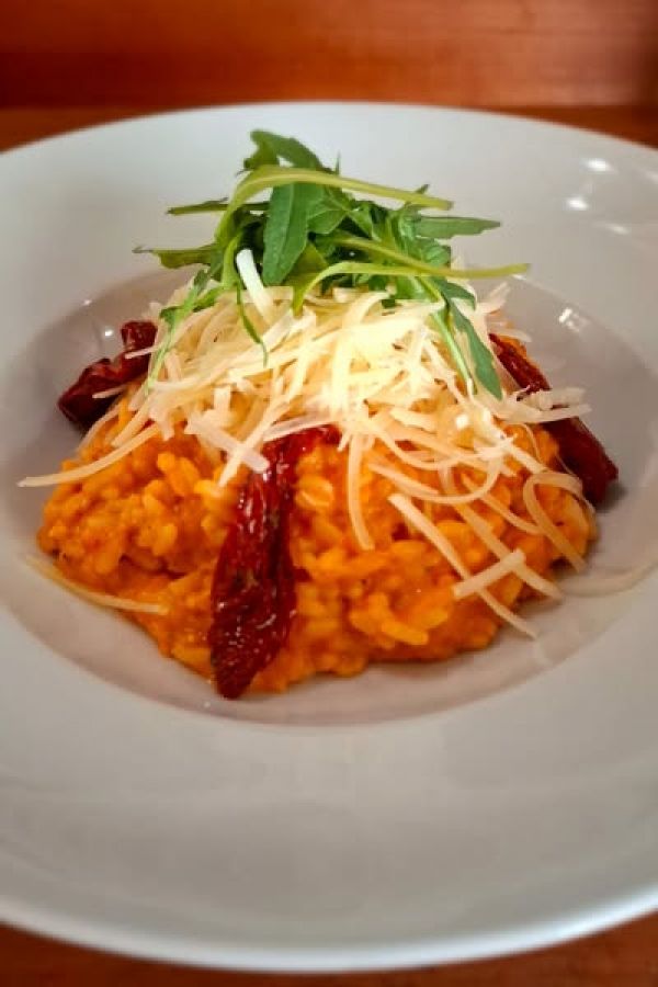 Italské tomatové risotto s mozzarellovými kuličkami, rukolou, a bazalkovým pestem (7, 15)