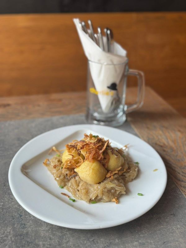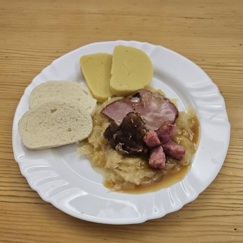 150g Vepřové výpečky, pečená klobása a uzená krkovice podávaná s dušeným kysaným zelím a houskovým knedlíkem, vídeňská cibulka
