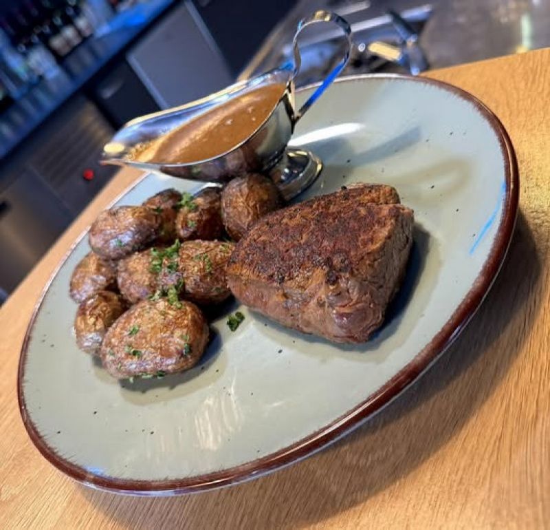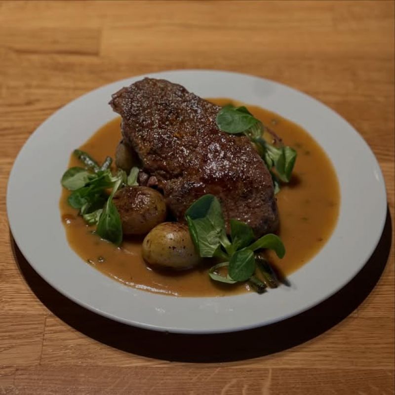 A Grilovaný rump steak z uruguayského býka pečené baby brambory, restované fazolové lusky, pepřová omáčka 17