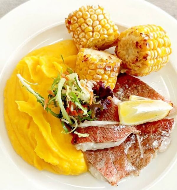 Grilovaná vepřová krkovice s máslovou kukuřicí s chilli, demi-glace omáčka, pečené brambory