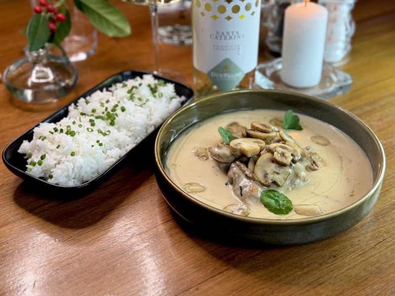 Nudličky z vepřové panenky a pečeně se žampiony v portské omáčce s jasmínovou rýží +pol. (A-bezlepkové,7)