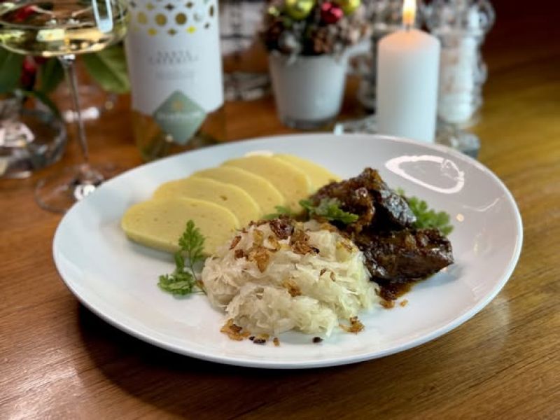 Vepřové výpečky, dušená kapusta, selský bramborový knedlík