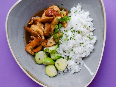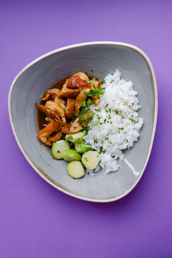 (Teriyaki tofu, kulatozrnná rýže, chilli mayo, čerstvá