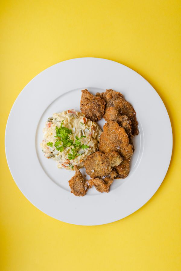 Křehký kuřecí řízek marinovaný v jogurtu, bramborový salát s majonézou
