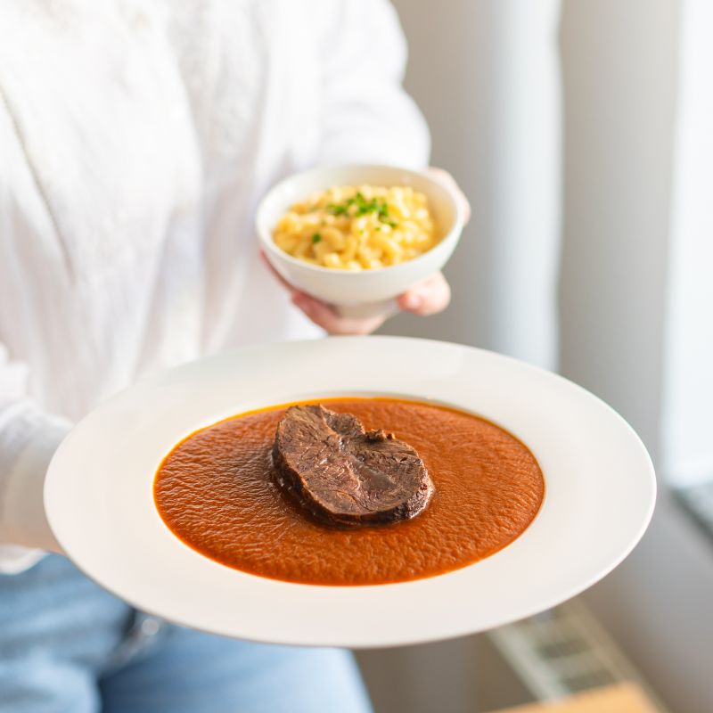 Hovězí líčka na kořenové zelenině a víně, šťouchané brambory