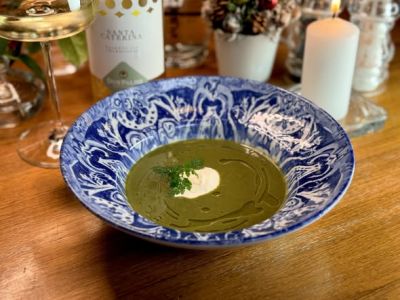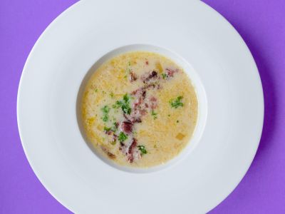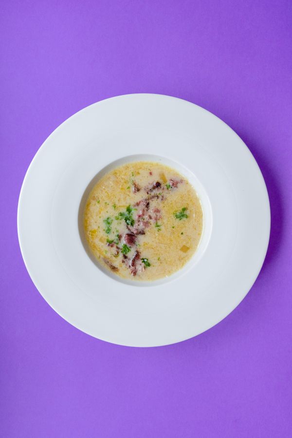 Polévka: Valašská kyselice s uzeninou, švestkami a zakysanou smetanou
