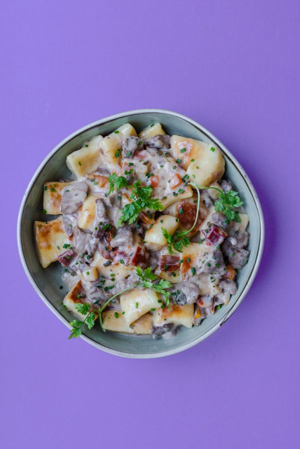 VEPŘOVÝ VRABEC NA LISTOVÉM ŠPENÁTU Opečené bramborové noky