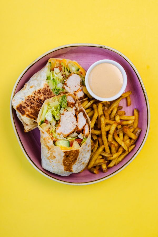 3) Karlův kuřecí Twister Wrap (Kuřecí stripsy, cherry rajčátka, cheddar, česneková majonéza, křupavý ledový salát, tortilla) a hranolky a dresink (1,3,6,7,8) 100g