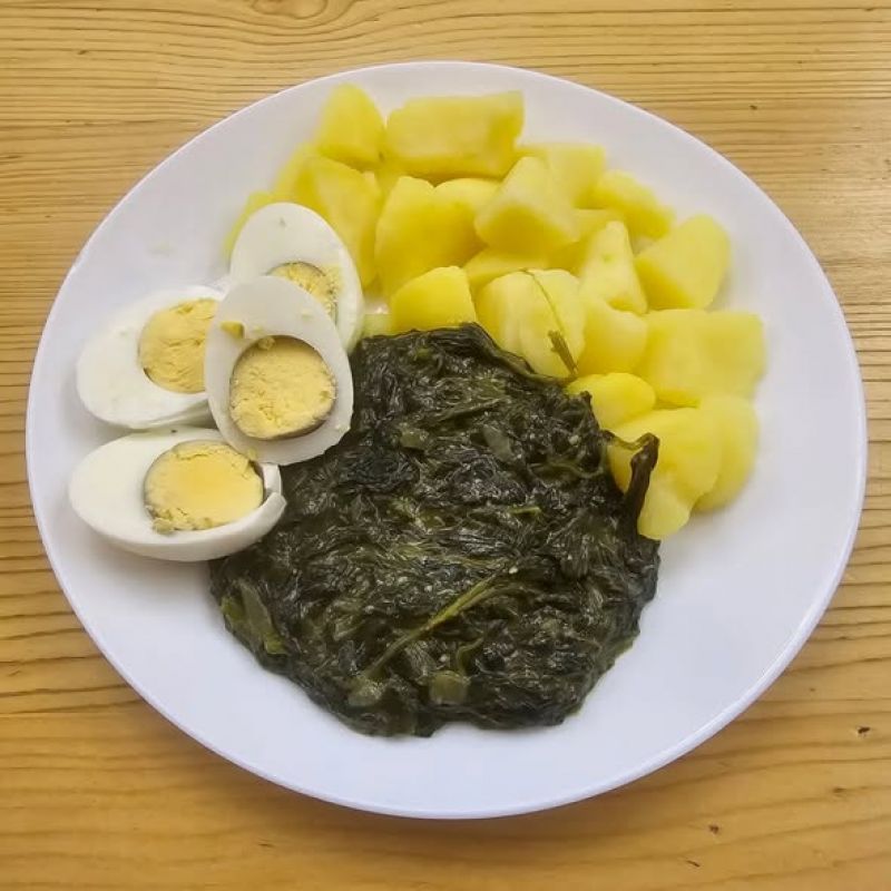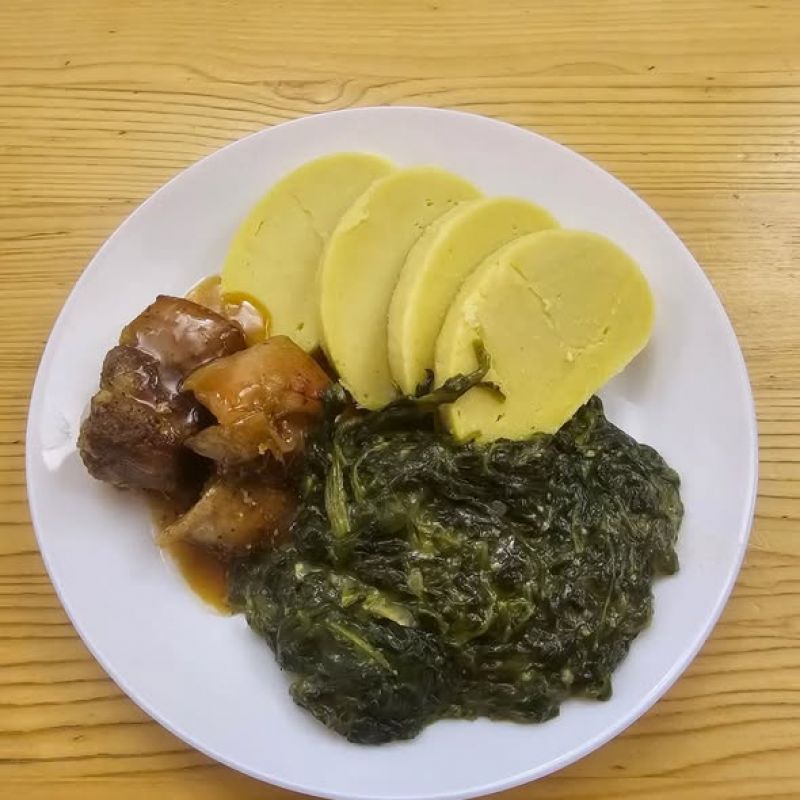 Vepřový vrabec, dušený špenát, vařený brambor 13.7